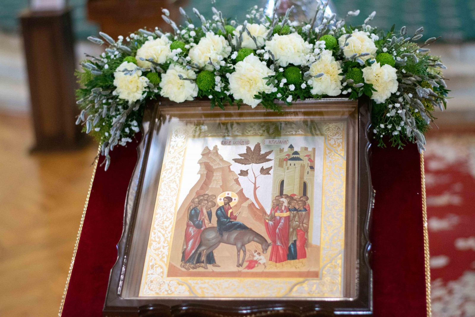 "За шість днів до Пасхи прийшов Іісус у Віфанію, де був Лазар померлий, якого Він воскресив з мертвих. Там приготували Йому вечерю, і Марфа прислуговувала, а Лазар був одним з тих, що возлежали з Ним. Марія ж, взявши фунт нардового чистого дорогоцінного мира, помазала ноги Іісуса і обтерла волоссям своїм ноги Його; і дім наповнився пахощами від мира. Тоді один з учнів Його, Іуда Симонів Іскаріот, який хотів видати Його, сказав: а чому було б не продати це миро за триста динаріїв і не роздати убогим? Сказав же він це не тому, що піклувався про убогих, а тому, що був злодій. Він мав при собі грошову скриньку і носив, що туди вкидали. Іісус же сказав: залиште її; вона зберегла це до дня погребіння Мого. Бо вбогих завжди маєте з собою, а Мене не завжди. Багато з іудеїв дізналися, що Він там, і прийшли не тільки заради Іісуса, але щоб бачити і Лазаря, котрого Він воскресив з мертвих. Первосвященники ж змовились убити і Лазаря, бо заради нього багато з іудеїв приходили і вірували в Іісуса. Другого дня багато народу, що прийшли на свято, почувши, що Іісус іде в Ієрусалим, взяли пальмове віття, вийшли назустріч Йому і вигукували: осанна! благословен Грядущий в ім'я Господнє, Цар Ізраїлів! Іісус же, знайшовши молодого осла, сів на нього, як написано: не бійся, дочко Сіонова! ось, Цар твій гряде, сидячи на молодому ослі. Учні Його спочатку не зрозуміли цього, але коли прославився Іісус, тоді згадали, що так було про Нього написано, і це зробили Йому. Народ, що був з Ним раніше, свідчив, що Він викликав Лазаря із гробу і воскресив його з мертвих. Тому і зустрів Його народ, бо чув, що Він сотворив це чудо" (Іоанна 12:1-18).